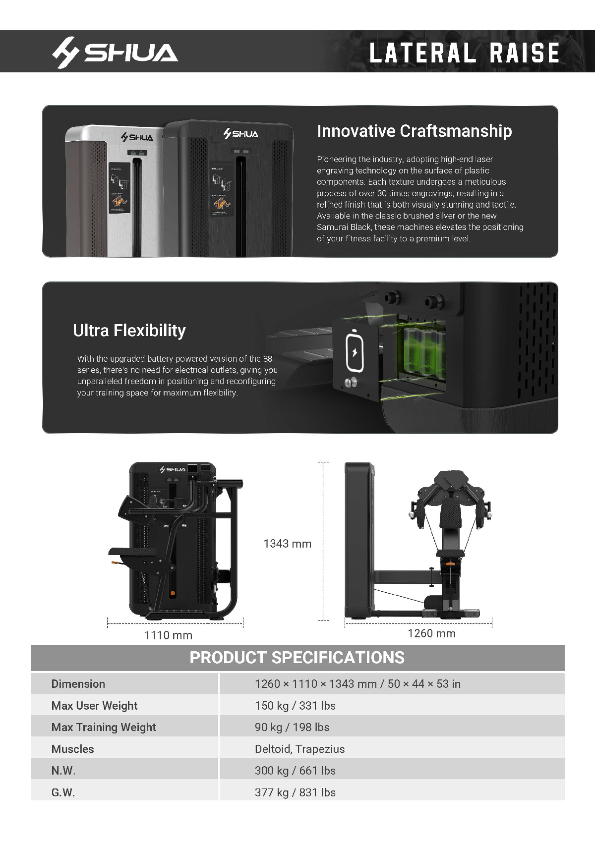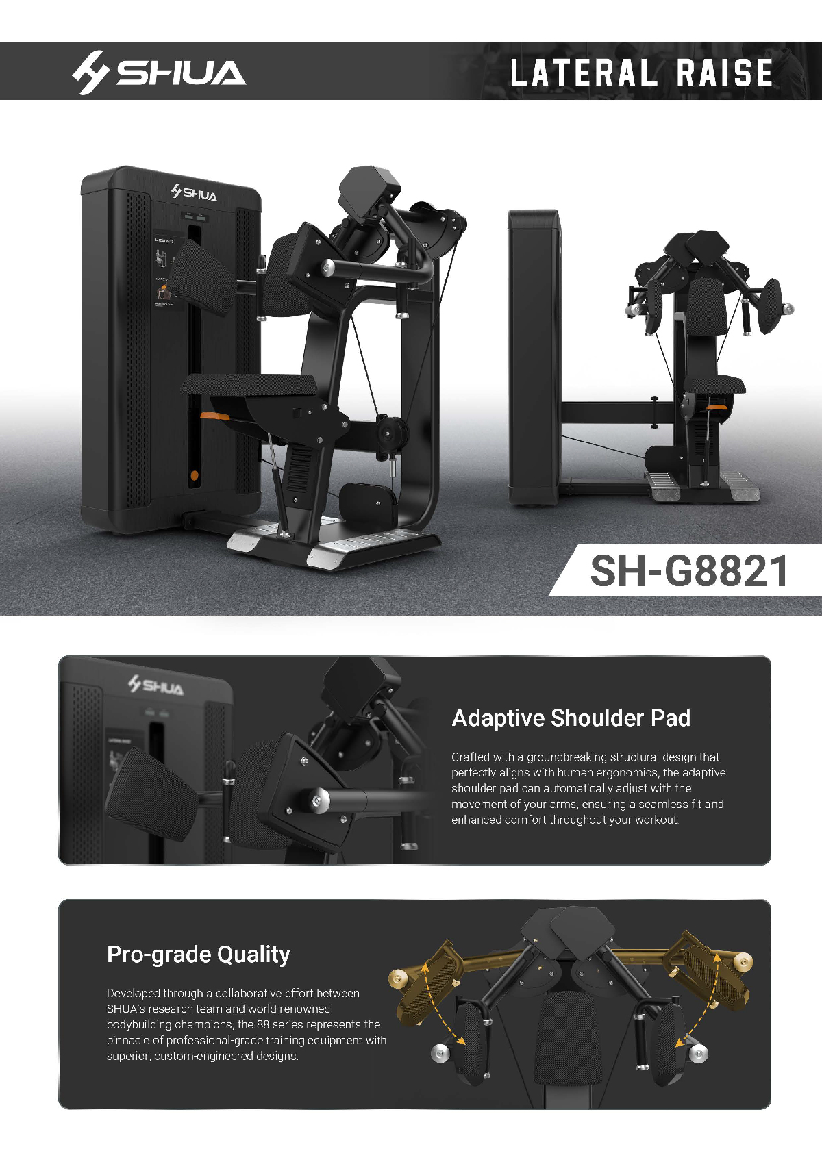 SH-G8821 Lateral Raise combines ergonomic design, adaptive shoulder pads, and premium laser-engraved finishes in brushed silver or Samurai Black. Part of SHUA’s flagship 88 series, it offers professional-grade quality and a battery-powered option for unmatched flexibility in gym setups.