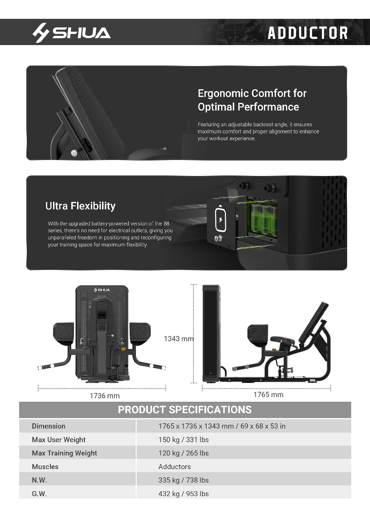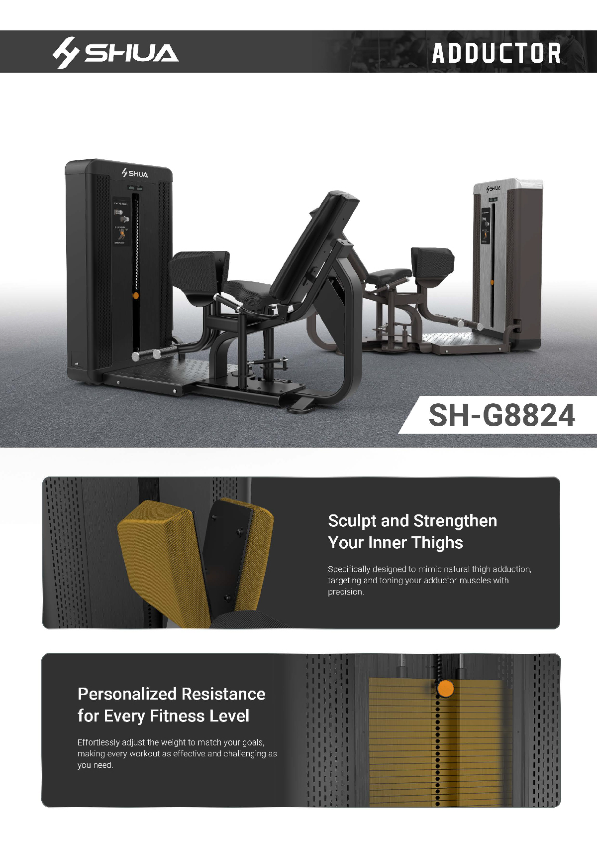 The SH-G8824 Adductor is engineered with ergonomics at its core, ensuring each workout aligns with the body's natural movement for maximum comfort. It efficiently targets the inner thigh muscles, delivering a seamless and effective training experience that supports natural lower body motion.