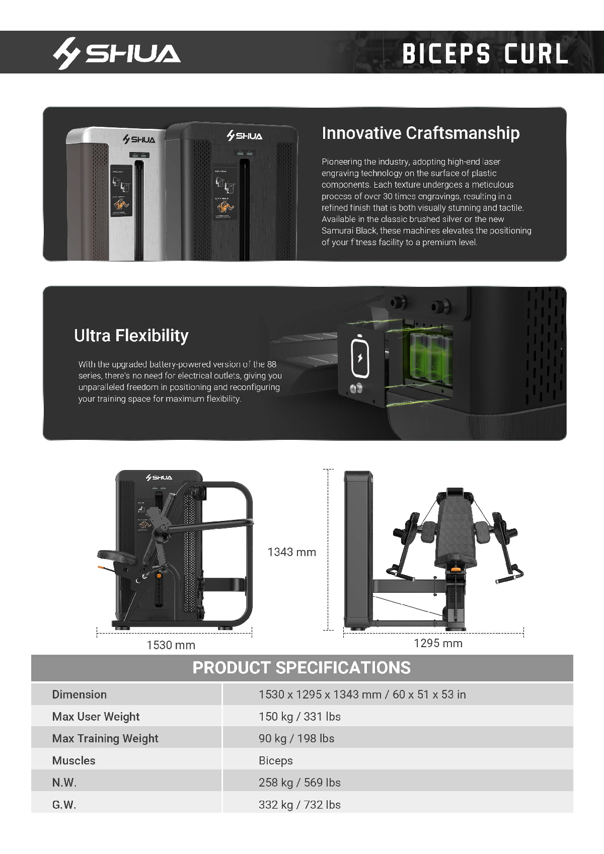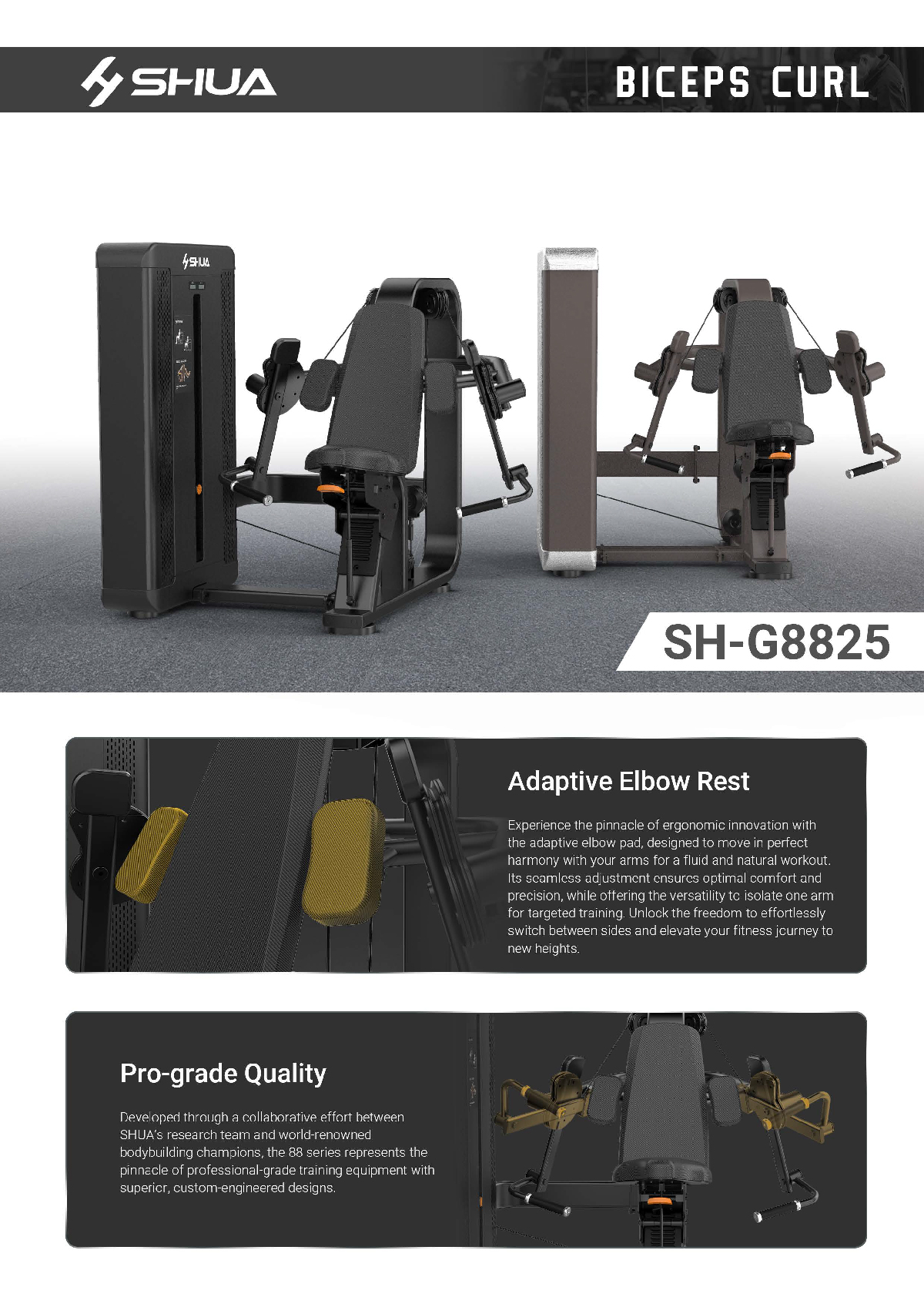 The SH-G8825 Biceps Curl, with its sleek all-black design, is built for efficient upper arm exercise. The adaptive elbow pads seamlessly follow arm movement, making each curl smoother and more natural. Combined with rotating handles, this design provides maximum comfort and optimal muscle engagement with minimal strain.