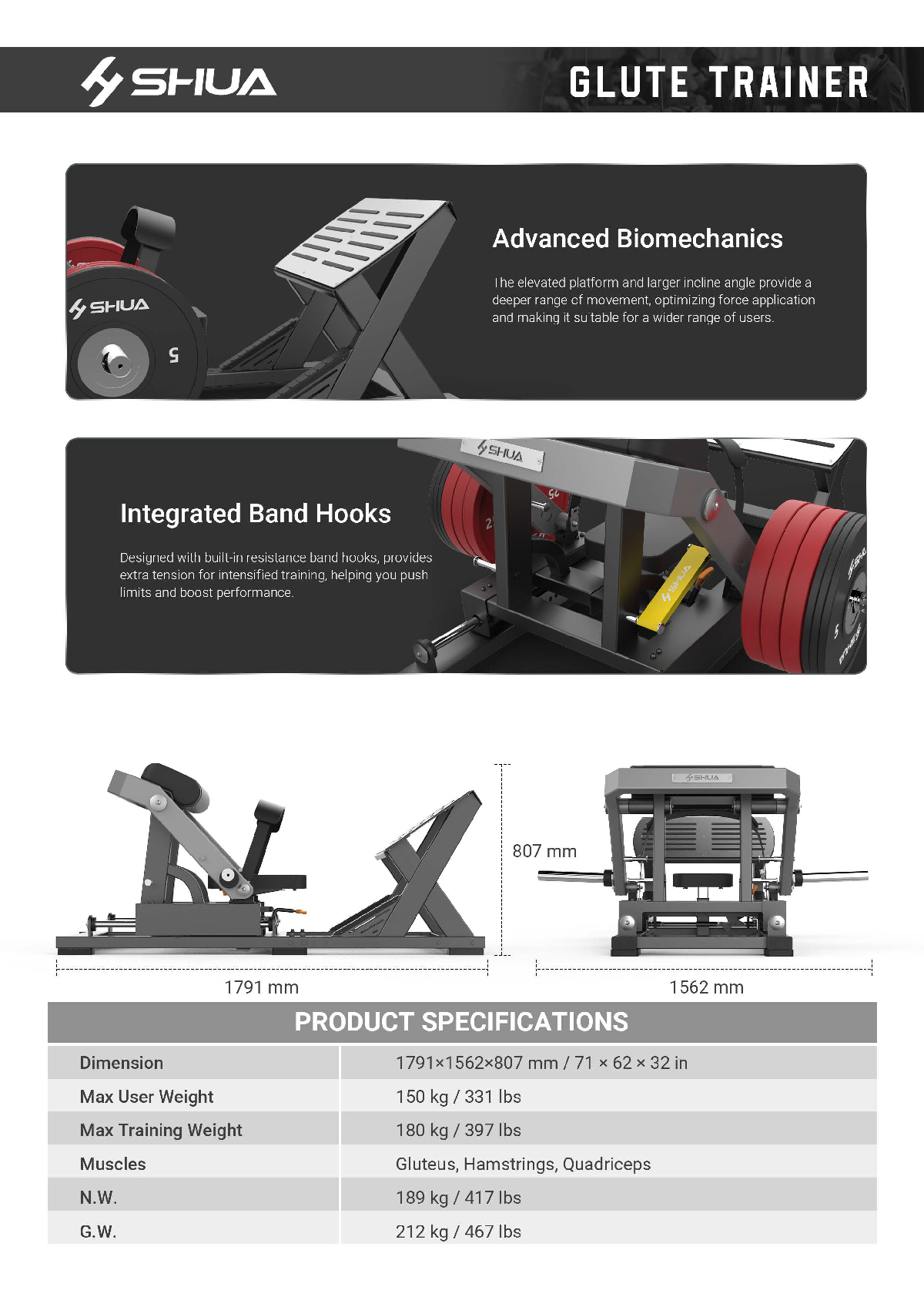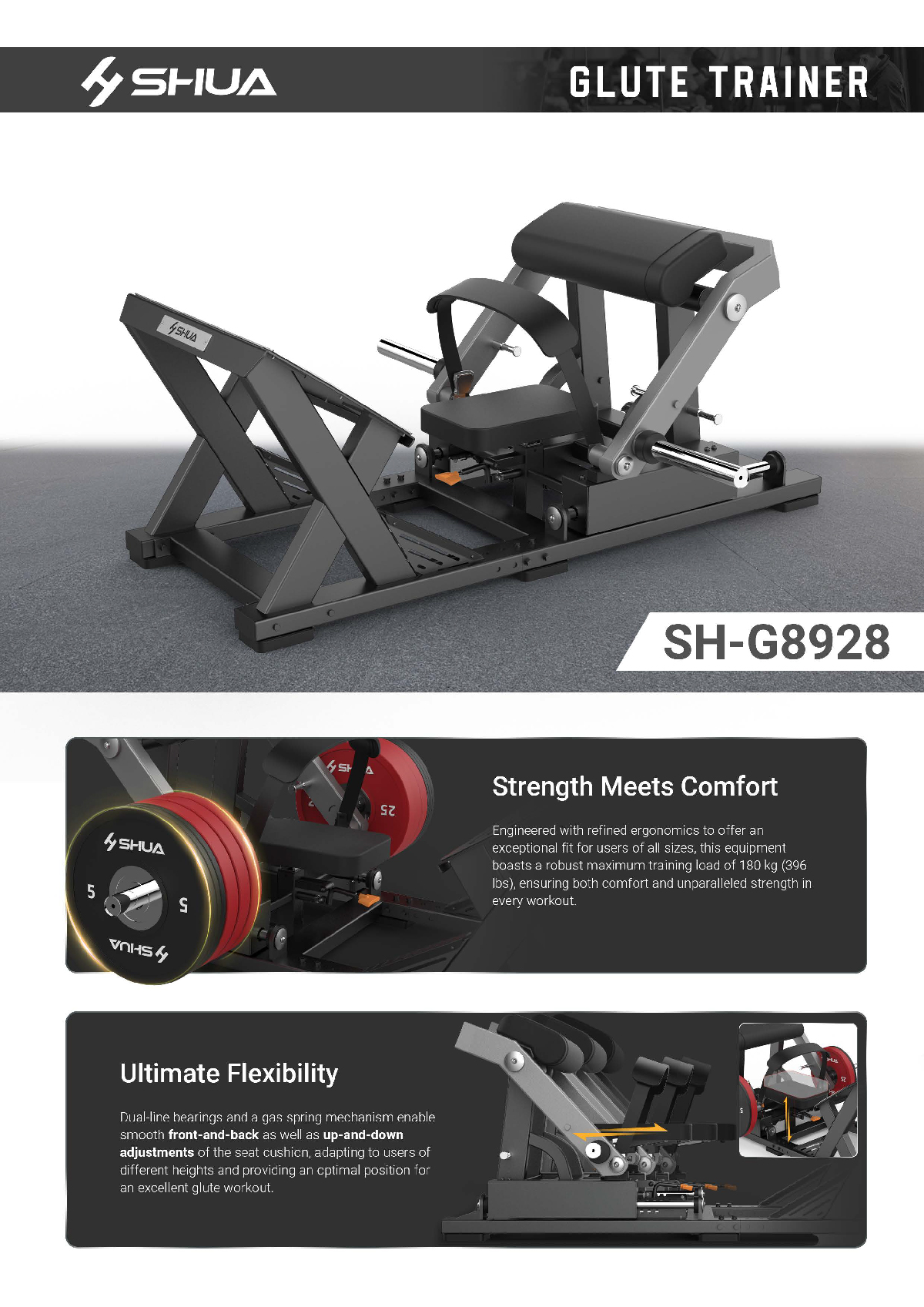 The SH-G8928 Glute Trainer is a specialized glute training machine designed for users of all fitness levels, targeting the gluteus maximus with a maximum load of 180 kg (396 lbs). Its elevated platform and larger incline angle allow for a deeper range of movement, while dual-line bearings ensure optimal seat adjustments. Built-in resistance band hooks enhance training intensity, and high-strength metal construction provides durability and stability for intense glute workouts.