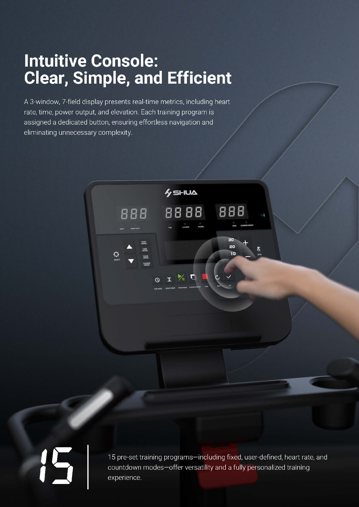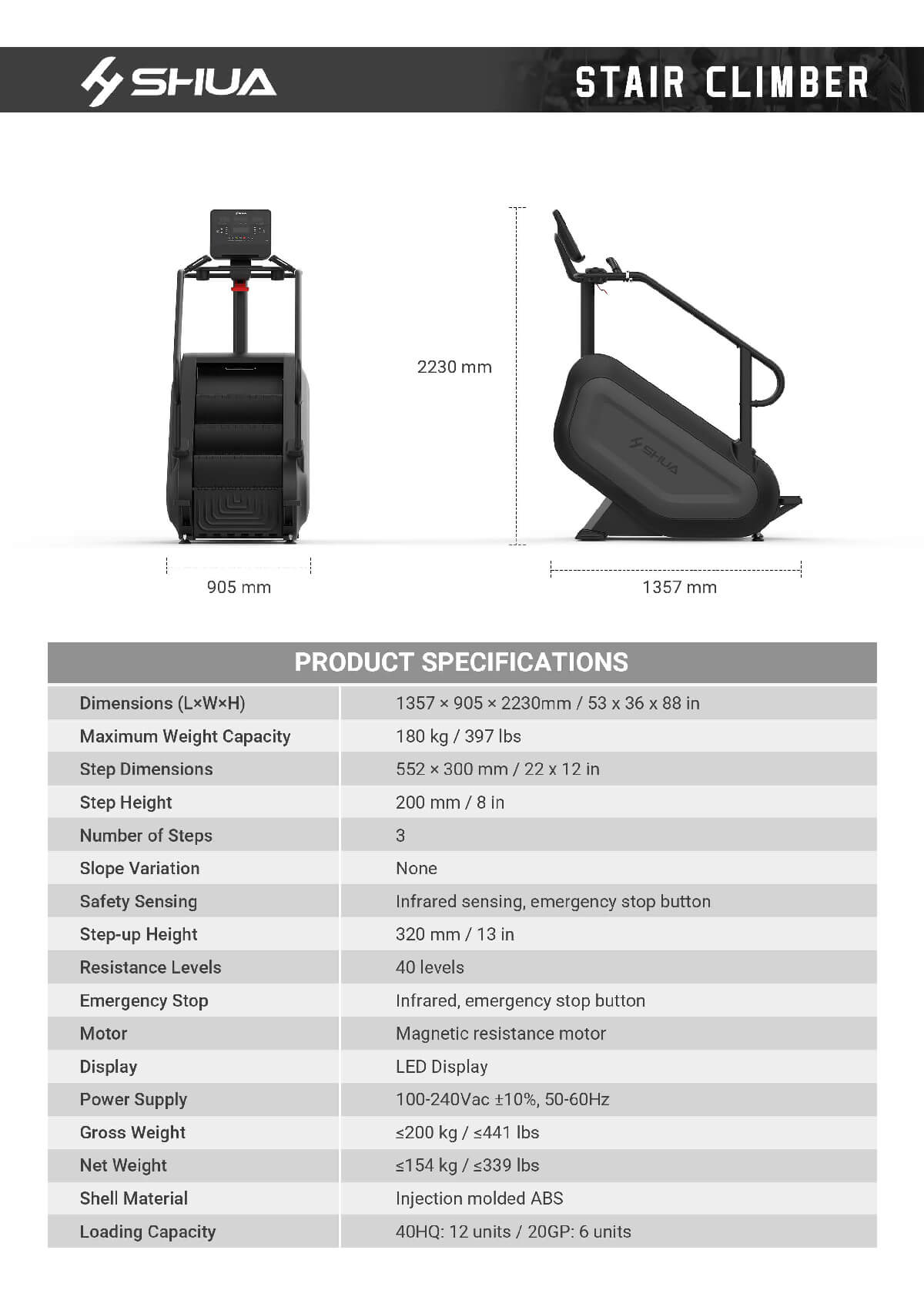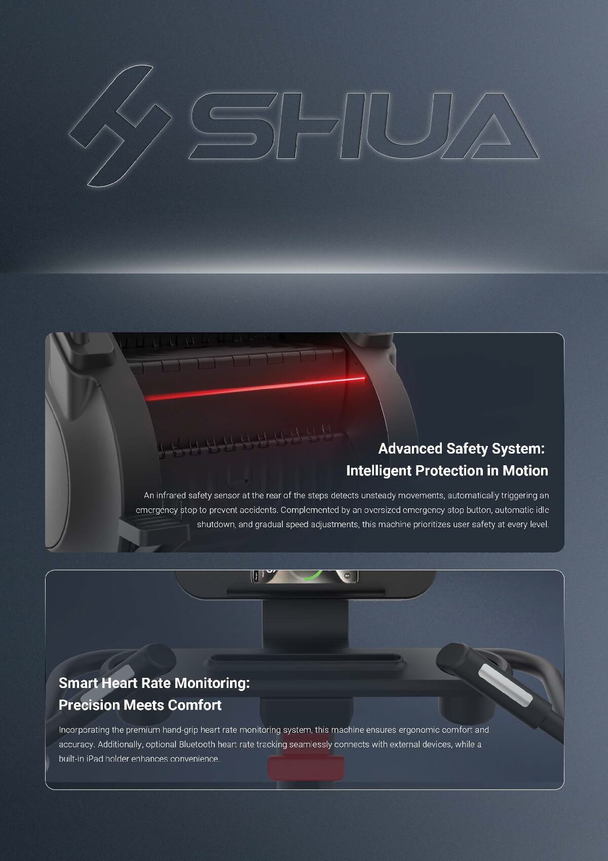 SH-S8901 Stair Climber provides a versatile workout with 40 resistance levels and 15 pre-set programs, catering to various fitness goals. Its oversized, textured steps ensure stability, while wireless charging, an iPad stand, and heart rate monitoring add convenience. Designed for safety and comfort, it features ergonomic handrails and an intuitive interface, making it suitable for all users.